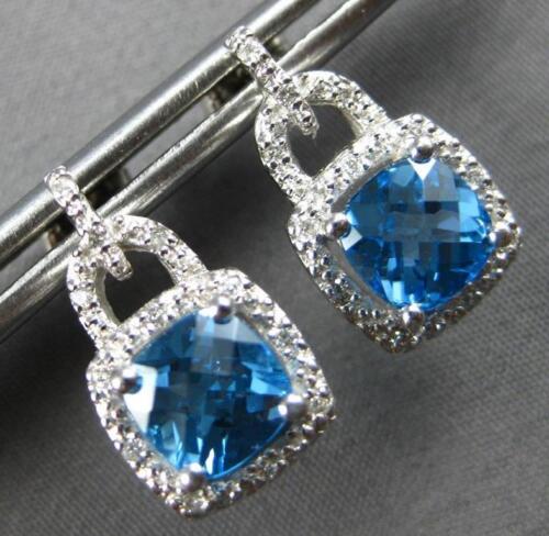 14KT WHITE GOLD HANGING EARRINGS. 3D HALO LOVE KNOT DESIGN. ROUND DIAMONDS ARE F/G COLOR, VSSI CLARITY .12 CARATS. AAA EXTRA FACETED CUSHION CUT BLUE TOPAZES ARE 1.95 CARATS. MEASURES 16mm X 9mm. WRITTEN APPRAISAL AVAILABLE. COMES IN A PRESENTABLE GIFT BOX.