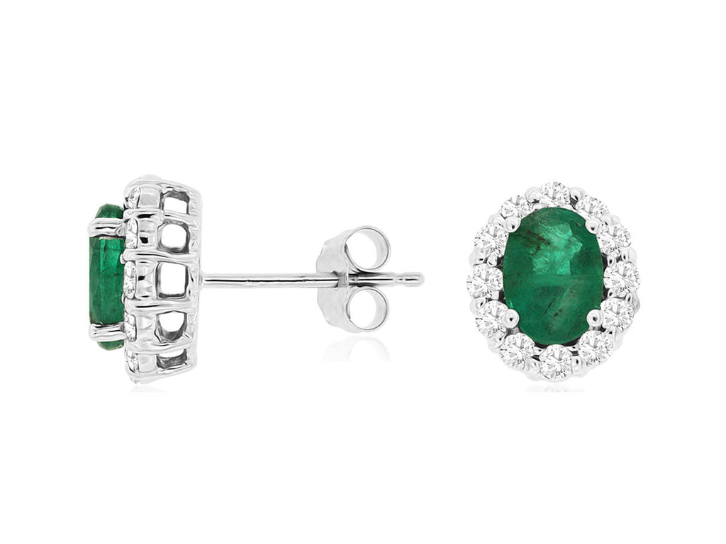 14KT WHITE GOLD STUD EARRINGS. 3D CLASSIC FLOWER DESIGN. ROUND DIAMONDS ARE F/G COLOR, VSSI CLARITY .60 CARATS. AAA OVAL EMERALDS ARE 1.40 CARATS. WRITTEN APPRAISAL AVAILABLE. COMES IN A PRESENTABLE GIFT BOX.