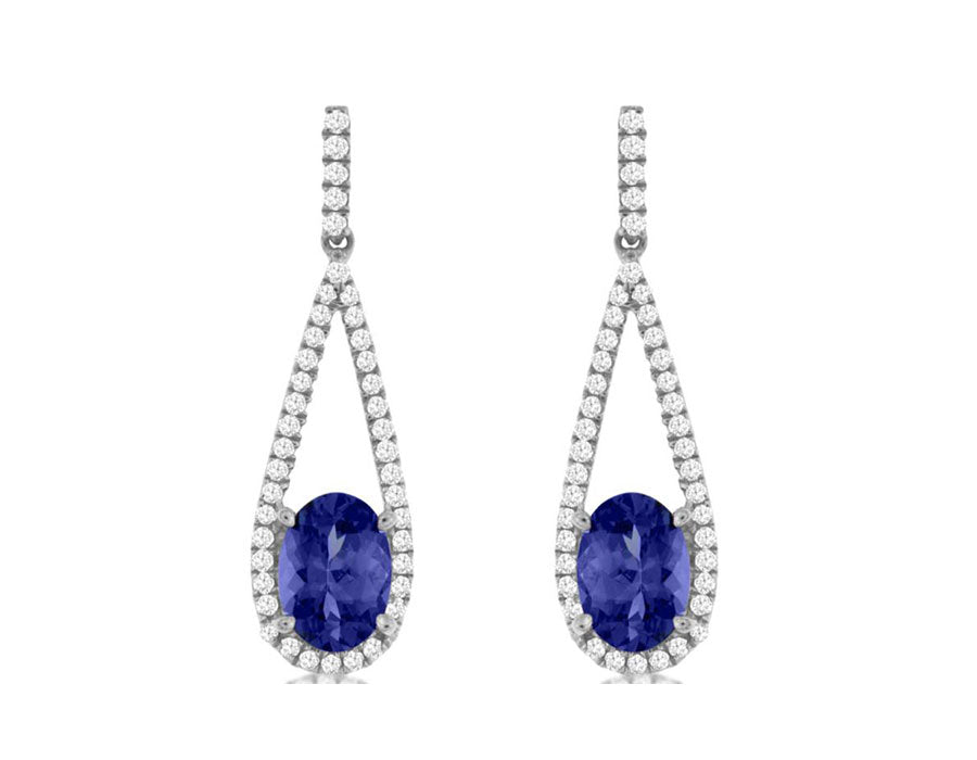 14KT WHITE GOLD HANGING EARRINGS. 3D TEAR DROP DESIGN. ROUND DIAMONDS ARE F/G COLOR, VSSI CLARITY .35 CARATS. AAA EXTRA FACETED OVAL TANZANITES ARE 1.65 CARATS. WRITTEN APPRAISAL AVAILABLE. COMES IN A PRESENTABLE GIFT BOX.