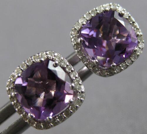 14KT WHITE GOLD STUD EARRINGS. 3D CLASSIC SQUARE HALO DESIGN. ROUND DIAMONDS ARE F/G COLOR, VSSI CLARITY .13 CARATS. AAA EXTRA FACETED CUSHION CUT AMETHYSTS ARE 2.0 CARATS. MEASURES 8.5mm WIDE. WRITTEN APPRAISAL AVAILABLE. COMES IN A PRESENTABLE GIFT BOX.