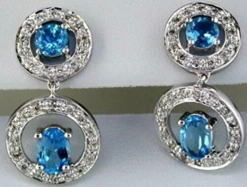 14KT WHITE GOLD HANGING EARRINGS. 3D CIRCULAR DESIGN. ROUND DIAMONDS ARE F/G COLOR, VSSI CLARITY .33 CARATS. AAA OVAL BLUE TOPAZ ARE 1.80 CARATS. WRITTEN APPRAISAL AVAILABLE. COMES IN A PRESENTABLE GIFT BOX.