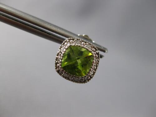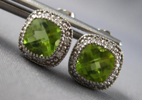 14KT WHITE GOLD STUD EARRINGS. 3D SQUARE HALO FILIGREE DESIGN. ROUND DIAMONDS ARE F/G COLOR, VSSI CLARITY .08 CARATS. AAA EXTRA FACETED CUSHION CUT PERIDOTS ARE 2.05 CARATS. MEASURES 9mm WIDE. WRITTEN APPRAISAL AVAILABLE. COMES IN A PRESENTABLE GIFT BOX.