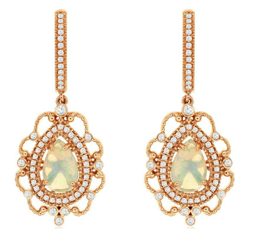 14KT ROSE GOLD HANGING EARRINGS. 3D TEAR DROP FILIGREE DESIGN. DIAMONDS ARE F/G COLOR, VSSI CLARITY .54 CARATS. AAA OPALS ARE 1.60 CARATS. WRITTEN APPRAISAL AVAILABLE. COMES IN A PRESENTABLE GIFT BOX.