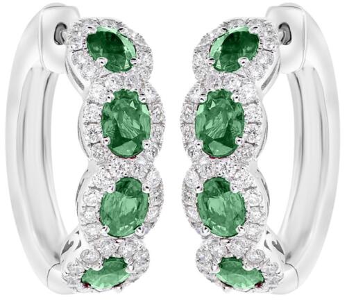18KT WHITE GOLD HUGGIE HOOP HANGING EARRINGS. 3D MULTI FLOWER DESIGN. DIAMONDS ARE F/G COLOR, VSSI CLARITY .65 CARATS. AAA EMERALDS ARE 1.50 CARATS. WRITTEN APPRAISAL AVAILABLE. COMES IN A PRESENTABLE GIFT BOX.