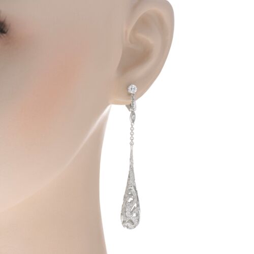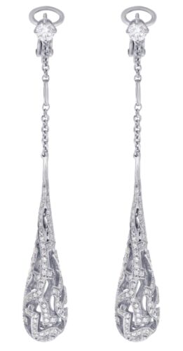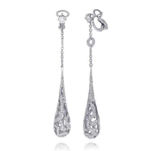 18KT WHITE GOLD CLIP ON HANGING EARRINGS. 3D ELONGATED TEAR DROP FILIGREE DESIGN. ROUND DIAMONDS ARE F/G COLOR, VSSI CLARITY 2.21 CARATS. WRITTEN APPRAISAL AVAILABLE. COMES IN A PRESENTABLE GIFT BOX.
