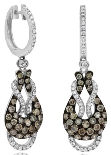14KT WHITE AND BLACK GOLD HUGGIE HANGING EARRINGS. 3D INFINITY LOVE TEAR DROP LOVE KNOT DESIGN. ROUND WHITE DIAMONDS ARE F/G COLOR, VSSI CLARITY .52 CARATS. ROUND CHOCOLATE FANCY DIAMONDS ARE 1.71 CARATS.