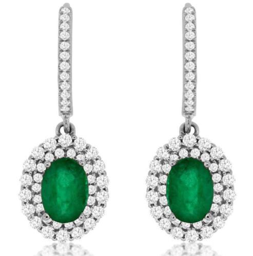 2.25CT DIAMOND & AAA EMERALD 14KT WHITE GOLD OVAL DOUBLE HALO HANGING EARRINGS