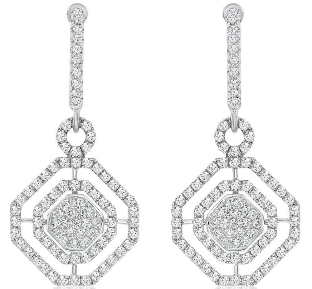 18KT WHITEGOLD FUN HANGINGEARRINGS. 3D CLUSTER OCTAGON DOUBLE HALODESIGN. DIAMONDS ARE F/G COLOR, VSSI CLARITY 2.26CARATS. WRITTEN APPRAISAL AVAILABLE. COMES IN A PRESENTABLE GIFT BOX.