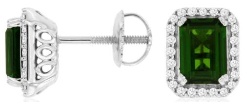 2.2CT DIAMOND & AAA RUSSALITE 14K WHITE GOLD EMERALD CUT HALO SCREWBACK EARRINGS