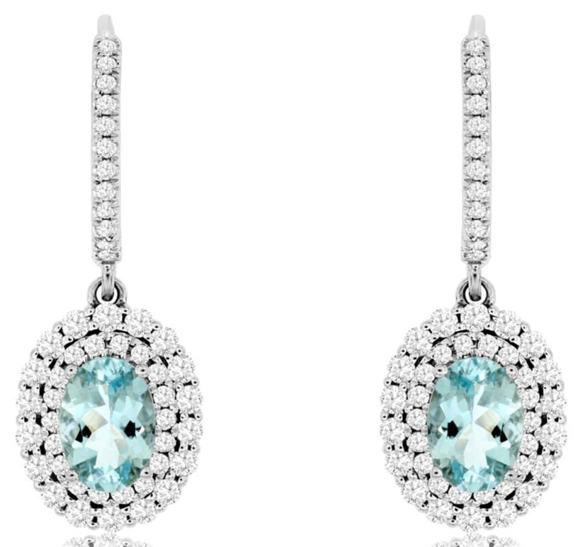 14KT WHITE GOLD HANGING EARRINGS. 3D DOUBLE HALO FLOWER DESIGN. ROUND DIAMONDS ARE F/G COLOR, VSSI CLARITY 0.85 CARATS. AAA OVAL AQUAMARINE IS 1.35 CARATS. WRITTEN APPRAISAL AVAILABLE. COMES IN A PRESENTABLE GIFT BOX.