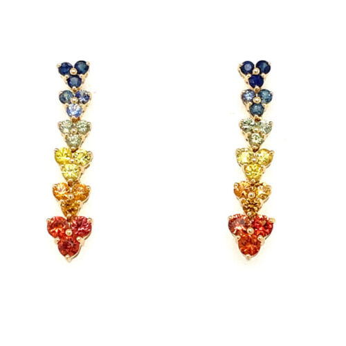 18KT YELLOW GOLD HANGING EARRINGS. 3D GRADUATING TRIANGULAR CHANDELIER RAINBOW ESIGN. AAA MULTI COLOR SAPPHIRES ARE 2.31 CARATS. WRITTEN APPRAISAL AVAILABLE. COMES IN A PRESENTABLE GIFT BOX.