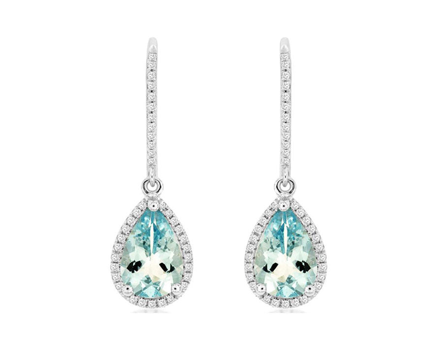 14KT WHITE GOLD LEVERBACK HANGING EARRINGS. 3D HALO TEAR DROP DESIGN. ROUND DIAMONDS ARE F/G COLOR, VSSI CLARITY .22 CARATS. AAA EXTRA FACETED PEAR SHAPE AQUAMARINES ARE 2.10 CARATS. WRITTEN APPRAISAL AVAILABLE. COMES IN A PRESENTABLE GIFT BOX.