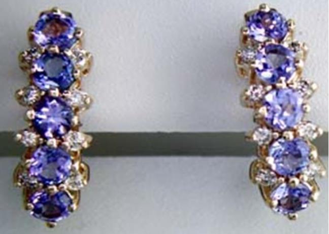 14KT YELLOW GOLD HANGING EARRINGS. 3D ROUND CLASSIC THREE ROW CLIP ON DESIGN. DIAMONDS ARE F/G COLOR, VSSI CLARITY .37 CARATS. AAA TANZANITES ARE 2.0 CARATS. WRITTEN APPRAISAL AVAILABLE. COMES IN A PRESENTABLE GIFT BOX.