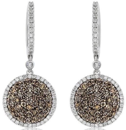 14KT WHITEGOLD LEVERBACKHANGING EARRINGS. 3D CLUSTER ROUNDDESIGN. WHITE DIAMONDS ARE F/G COLOR, VSSI CLARITY.61 CARATS. CHOCOLATE FANCY DIAMONDS ARE 1.76 CARATS. WRITTEN APPRAISAL AVAILABLE. COMES IN A PRESENTABLE GIFT BOX.