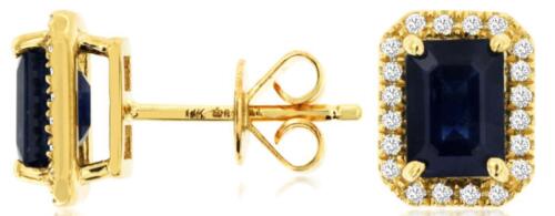 14KT YELLOW GOLD STUD EARRINGS. 3D SQUARE HALO DESIGN. ROUND DIAMONDS ARE F/G COLOR, VSSI CLARITY .20 CARATS. AAA EMERALD CUT SAPPHIRES ARE 2.18 CARATS. WRITTEN APPRAISAL AVAILABLE. COMES IN A PRESENTABLE GIFT BOX.