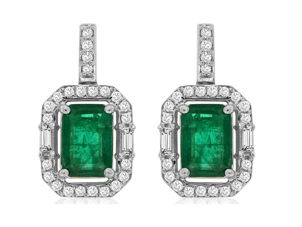 14KT WHITE GOLD HANGING EARRINGS. 3D HALO OCTAGON DESIGN. ROUND AND BAGUETTE DIAMONDS ARE F/G COLOR, VSSI CLARITY .36 CARATS. AAA SQUARE EMERALDS ARE 2.05 CARATS. WRITTEN APPRAISAL AVAILABLE. COMES IN A PRESENTABLE GIFT BOX.