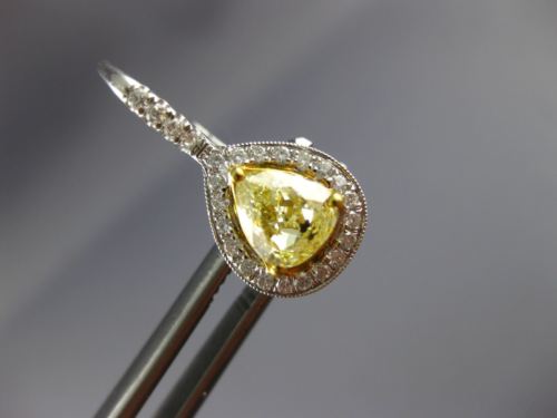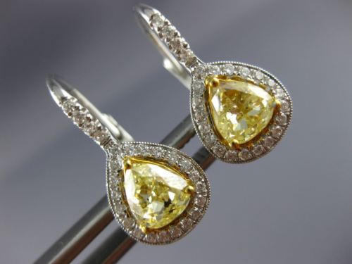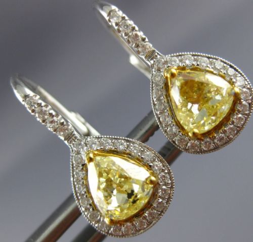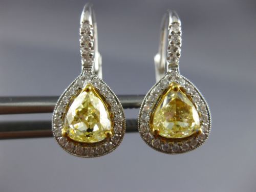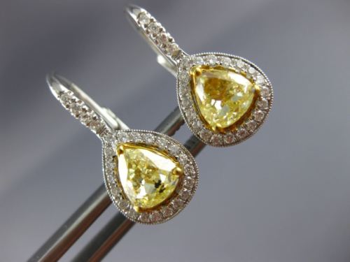 18KT WHITE AND YELLOW GOLD LEVERBACK HANGING EARRINGS. 3D CLASSIC DESIGN. DIAMONDS ARE F/G COLOR, VSSI CLARITY .37 CARATS. PEAR SHAPE FANCY YELLOW DIAMONDS ARE 2.07 CARATS. MEASURES 20mm X 10mm. WRITTEN APPRAISAL AVAILABLE. COMES IN A PRESENTABLE GIFT BOX.