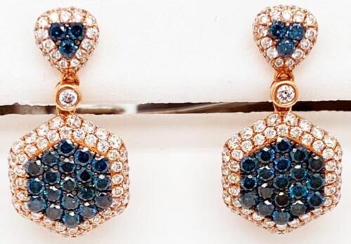 14KT ROSE GOLD FUN HANGING EARRINGS. 3D CLUSTER HEXAGON DOUBLE HALO TRIANGULAR DESIGN. ROUND WHITE DIAMONDS ARE F/G COLOR, VSSI CLARITY 1.28 CARATS. ROUND BLUE DIAMONDS ARE 1.17 CARATS.
