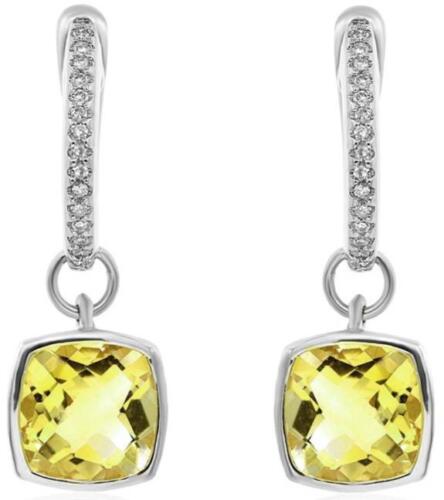 14KT WHITE GOLD FUN HANGING EARRINGS. 3D SOLITAIRE BEZEL DESIGN. ROUND DIAMONDS ARE F/G COLOR, VSSI CLARITY .11 CARATS. AAA EXTRA FACETED CUSHION CUT LEMON QUARTZ ARE 2.36 CARATS.
