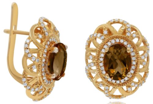 2.51CT DIAMOND & AAA SMOKY QUARTZ 14KT ROSE GOLD 3D OVAL & ROUND FLOWER EARRINGS
