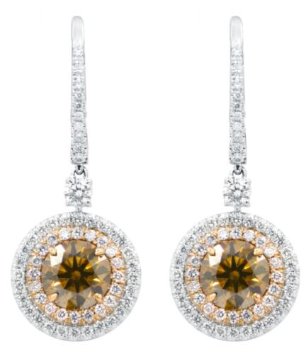 2.52CT WHITE & MOCHA DIAMOND 18KT 2 TONE GOLD ROUND DOUBLE HALO HANGING EARRINGS