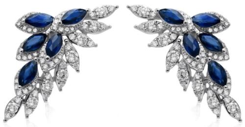 14KT WHITE GOLD FUN HANGING EARRINGS. 3D MULTI LEAF DESIGN. ROUND DIAMONDS ARE F/G COLOR, VSSI CLARITY .88 CARATS. AAA MARQUISE SHAPE SAPPHIRES ARE 1.65 CARATS.