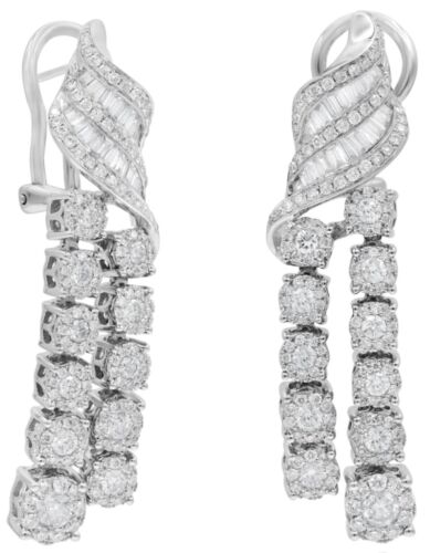 18KT WHITE GOLD CLIP ON HANGING EARRINGS. 3D TWO ROW GRADUATING MULTI FLOWER JOURNEY LEAF DESIGN. DIAMONDS ARE F/G COLOR, VSSI CLARITY 2.55 CARATS. ROUND DIAMONDS ARE 2.05 CARATS. BAGUETTE DIAMONDS ARE .50 CARATS.