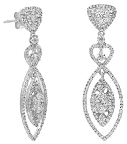 18KT WHITE GOLD FUN HANGING EARRINGS. 3D DOUBLE HEART INFINITY TEAR DROP TRIANGULAR DESIGN. ROUND DIAMONDS ARE F/G COLOR, VSSI CLARITY 2.55 CARATS. WRITTEN APPRAISAL AVAILABLE. COMES IN A PRESENTABLE GIFT BOX.