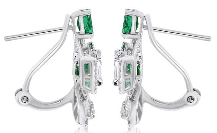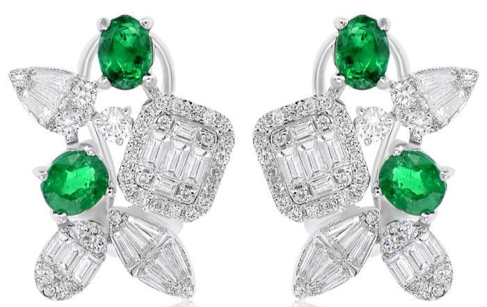 18KT WHITE GOLD STUDEARRINGS. 3D FLOWER DESIGN. ROUND AND BAGUETTEDIAMONDS ARE F/G COLOR, VSSI CLARITY 1.20 CARATS. AAA EMERALDS ARE 1.37 CARATS.WRITTEN APPRAISAL AVAILABLE. COMES IN A PRESENTABLE GIFT BOX.