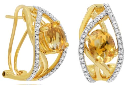14KT YELLOW GOLD HANGING EARRINGS. 3D CRISS CROSS LEAF CLIP ON DESIGN. ROUND DIAMONDS ARE F/G COLOR, VSSI CLARITY .37 CARATS. AAA EXTRA FACETED OVAL CIRINES ARE 2.26 CARATS. WRITTEN APPRAISAL AVAILABLE. COMES IN A PRESENTABLE GIFT BOX.