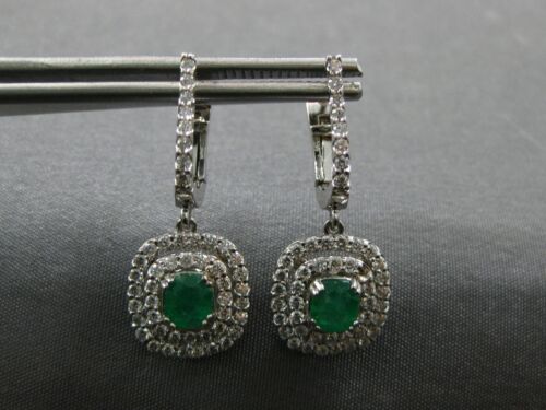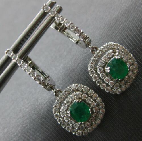 14KT WHITE GOLD FUN LEVERBACK HANGING EARRINGS. 3D DOUBLE HALO SQUARE DESIGN. ROUND DIAMONDS ARE F/G COLOR, VSSI CLARITY 1.50 CARATS. AAA OVAL EMERALDS ARE 1.20 CARATS. MEASURES 26mm X 12mm. WRITTEN APPRAISAL AVAILABLE. COMES IN A PRESENTABLE GIFT BOX.