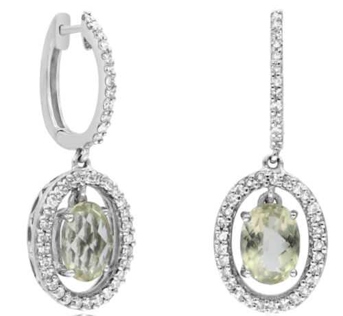 14KT WHITE GOLD HUGGIE HANGING EARRINGS. 3D CLASSIC HALO DESIGN. ROUND DIAMONDS ARE F/G COLOR, VSSI CLARITY .45 CARATS. AAA EXTRA FACETED OVAL LEMON QUARTZ ARE 2.27 CARATS.