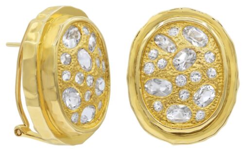14KT YELLOW GOLD EARRINGS. 3D CLASSIC ETOILE HAMMERED LOOK OVAL CLIP ON DESIGN. DIAMONDS ARE F/G COLOR, VSSI CLARITY .17 CARATS. MULTI SHAPE CRYSTALS ARE 2.55 CARATS.