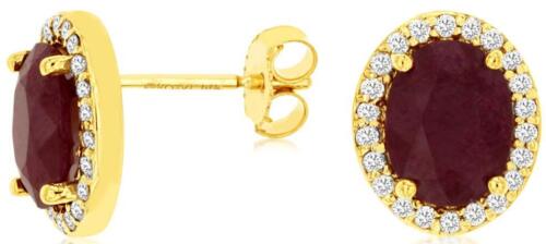 14KT YELLOW GOLD STUD EARRINGS. 3D CLASSIC HALO FLOWER DESIGN. ROUND DIAMONDS ARE F/G COLOR, VSSI CLARITY .28 CARATS. AAA OVAL RUBIES ARE 2.45 CARATS. WRITTEN APPRAISAL AVAILABLE. COMES IN A PRESENTABLE GIFT BOX.
