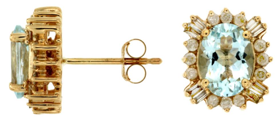 14KT YELLOW GOLD STUD EARRINGS. 3D FLOWER DESIGN. ROUND AND BAGUETTE DIAMONDS ARE F/G COLOR, VSSI CLARITY .50 CARATS. AAA OVAL AQUAMARINES ARE 2.20 CARATS. WRITTEN APPRAISAL AVAILABLE. COMES IN A PRESENTABLE GIFT BOX.
