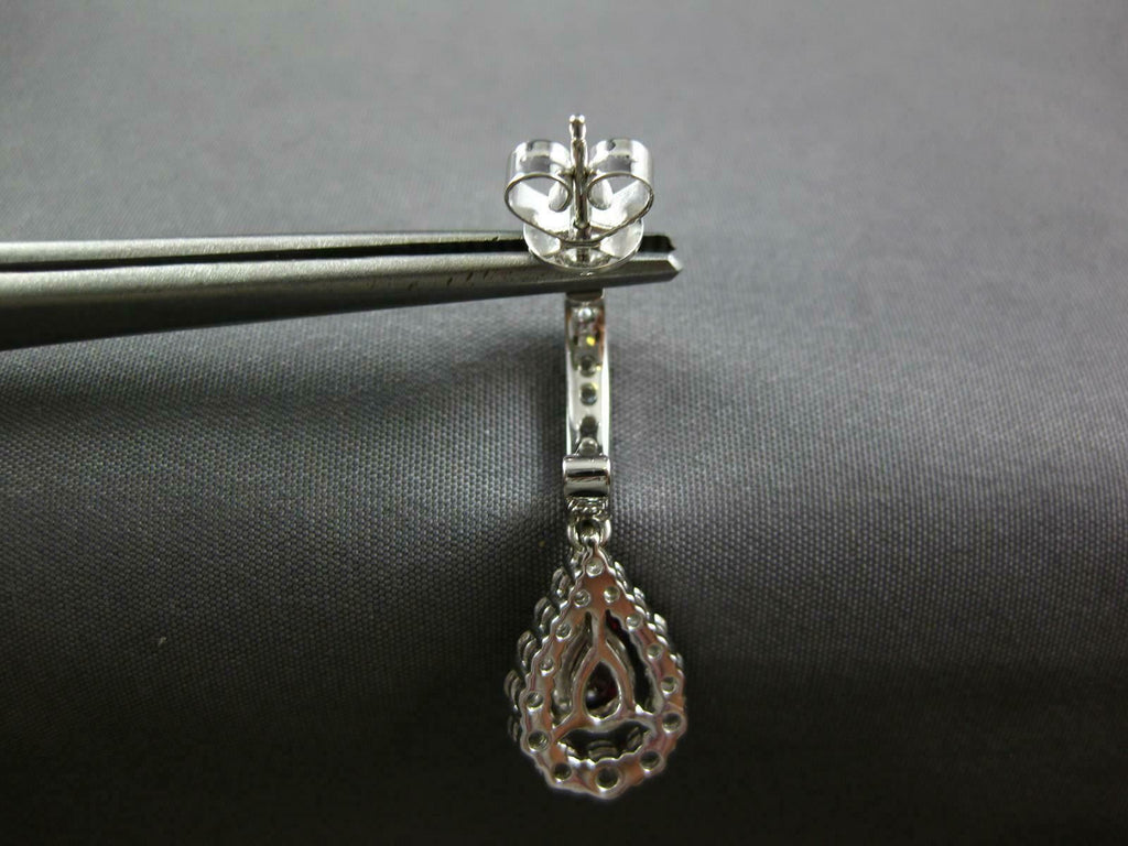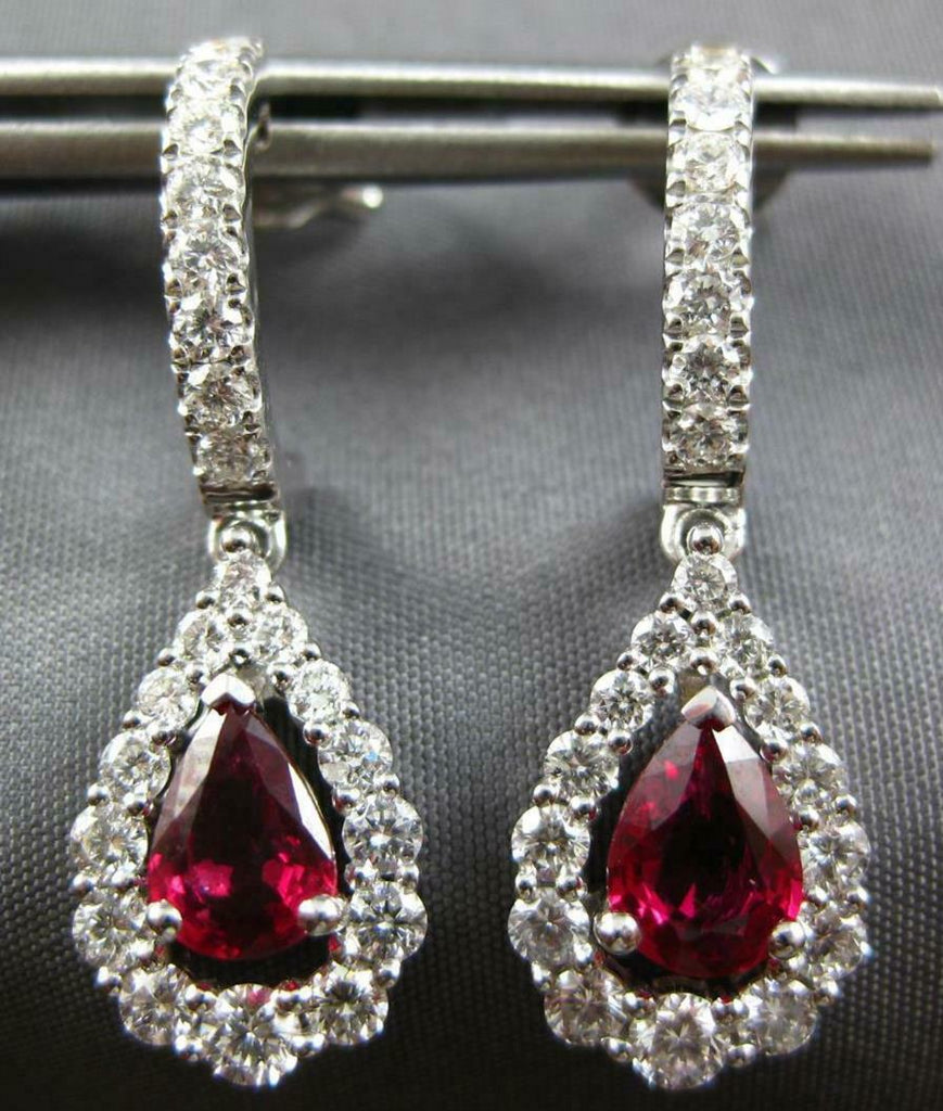 18KT WHITE GOLD HANGING EARRINGS. 3D TEAR DROP DESIGN. ROUND DIAMONDS ARE F/G COLOR, VSSI CLARITY 1.43 CARATS. AAA PEAR SHAPE RUBIES ARE 1.38 CARATS. MEASURES 9mm X 30mm. WRITTEN APPRAISAL AVAILABLE. COMES IN A PRESENTABLE GIFT BOX.