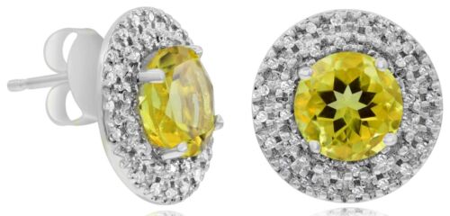 14KT WHITE GOLD STUD EARRINGS. 3D SOLITAIRE DOUBLE HALO FLOWER DESIGN. ROUND DIAMONDS ARE F/G COLOR, VSSI CLARITY .19 CARATS. AAA EXTRA FACETED ROUND LEMON QUARTZ ARE 2.67 CARATS. WRITTEN APPRAISAL AVAILABLE. COMES IN A PRESENTABLE GIFT BOX.
