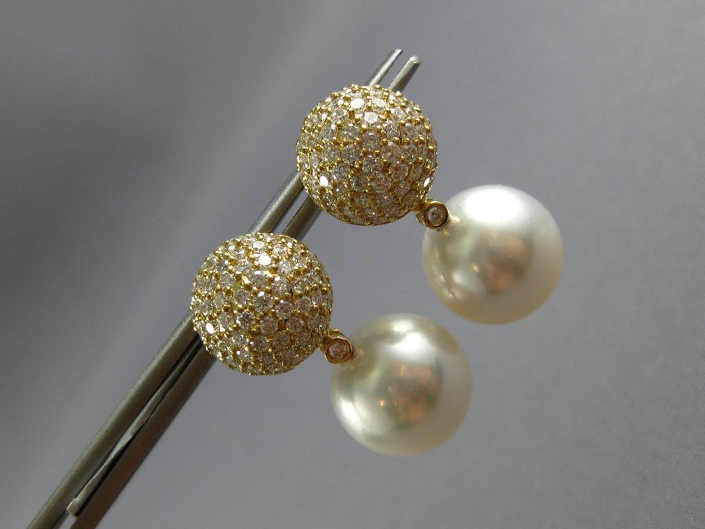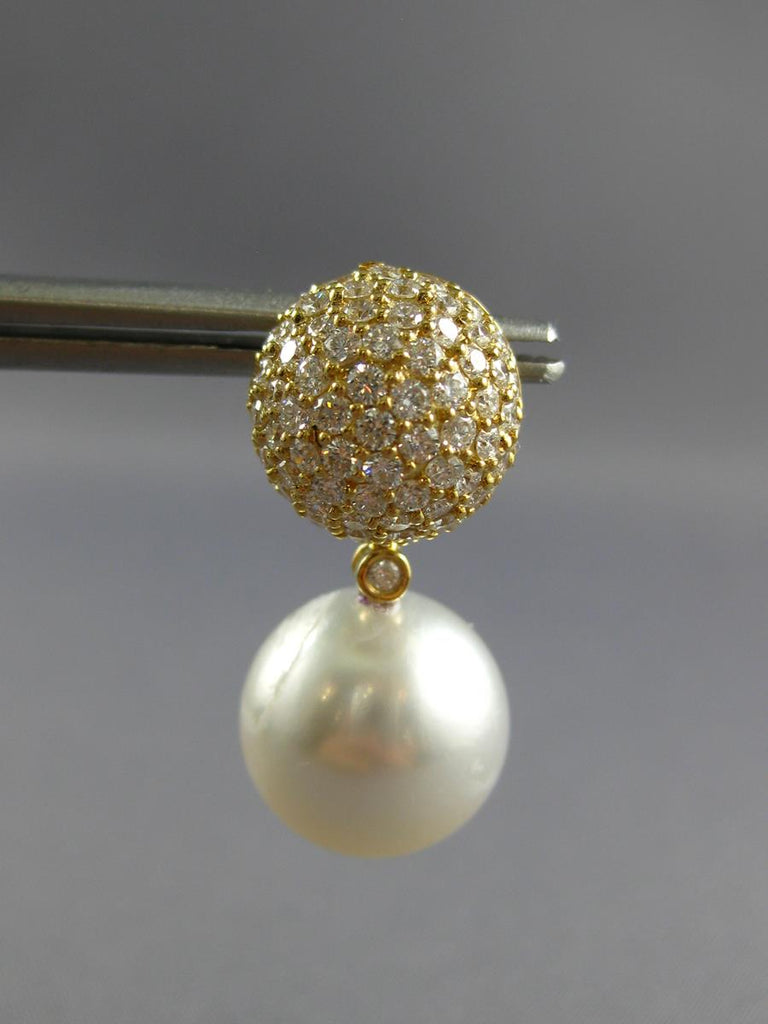 18KT YELLOW GOLD STUD EARRINGS. 3D CIRCULAR DOME DESIGN. DIAMONDS ARE F/G COLOR, VSSI CLARITY 2.06 CARATS. FEATURES 12mm WIDE AAA SOUTH SEA PEARLS. EARRINGS MEASURE 26mm X 12mm. WRITTEN APPRAISAL AVAILABLE. COMES IN A PRESENTABLE GIFT BOX.