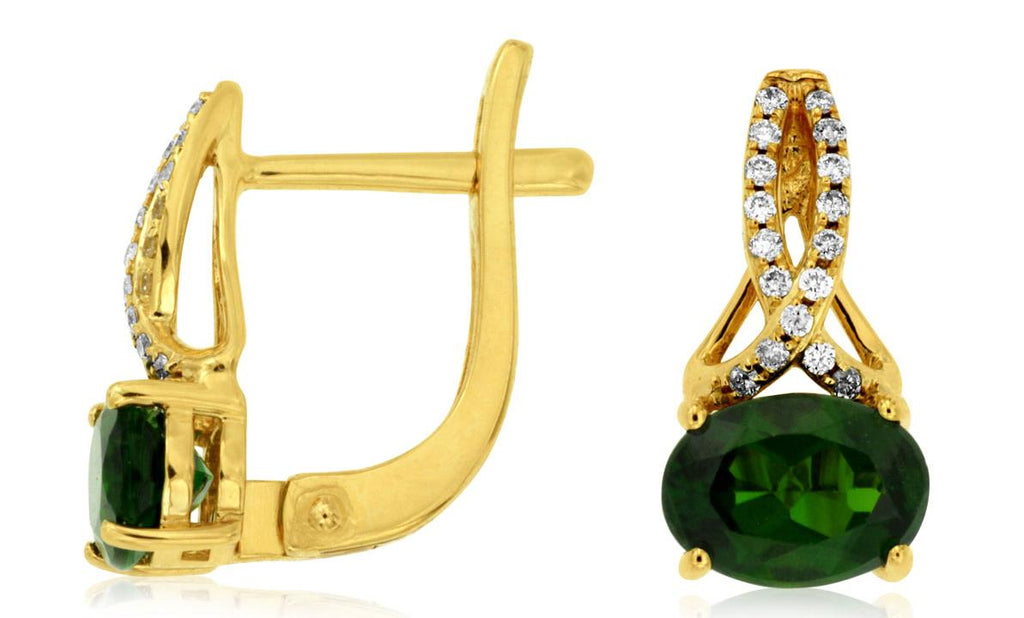 14KT YELLOW GOLD LEVERBACK HANGING EARRINGS. 3D CLASSIC DESIGN. ROUND DIAMONDS ARE F/G COLOR, VSSI CLARITY .10 CARATS. AAA OVAL RUSSALITES ARE 1.90 CARATS. WRITTEN APPRAISAL AVAILABLE. COMES IN A PRESENTABLE GIFT BOX.