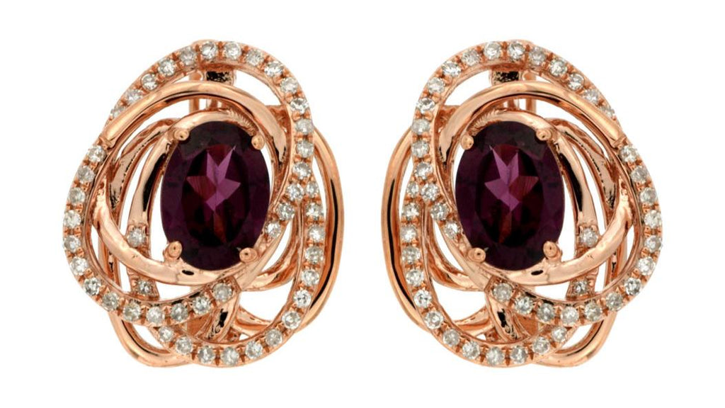 14KT ROSE GOLD FUN EARRINGS. 3D MULTI ROW INTERTWINING DESIGN. ROUND DIAMONDS ARE F/G COLOR, VSSI CLARITY .30 CARATS. AAA EXTRA FACETED OVAL RHODLITE IS 1.80 CARATS. WRITTEN APPRAISAL AVAILABLE. COMES IN A PRESENTABLE GIFT BOX.
