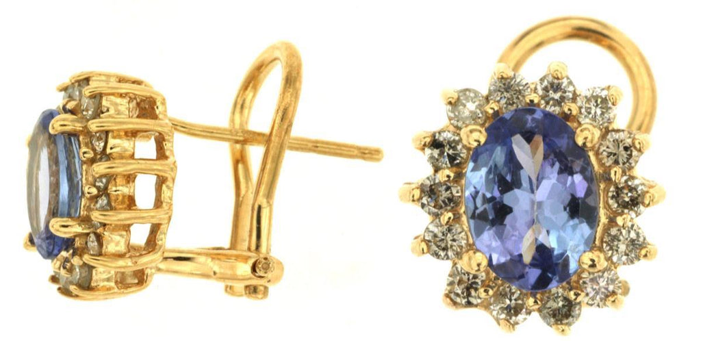 14KT YELLOW GOLD CLIP ON EARRINGS. 3D CLASSIC FLOWER DESIGN. ROUND DIAMONDS ARE F/G COLOR, VSSI CLARITY .60 CARATS. AAA OVAL TANZANITES ARE 1.50 CARATS. WRITTEN APPRAISAL AVAILABLE. COMES IN A PRESENTABLE GIFT BOX.