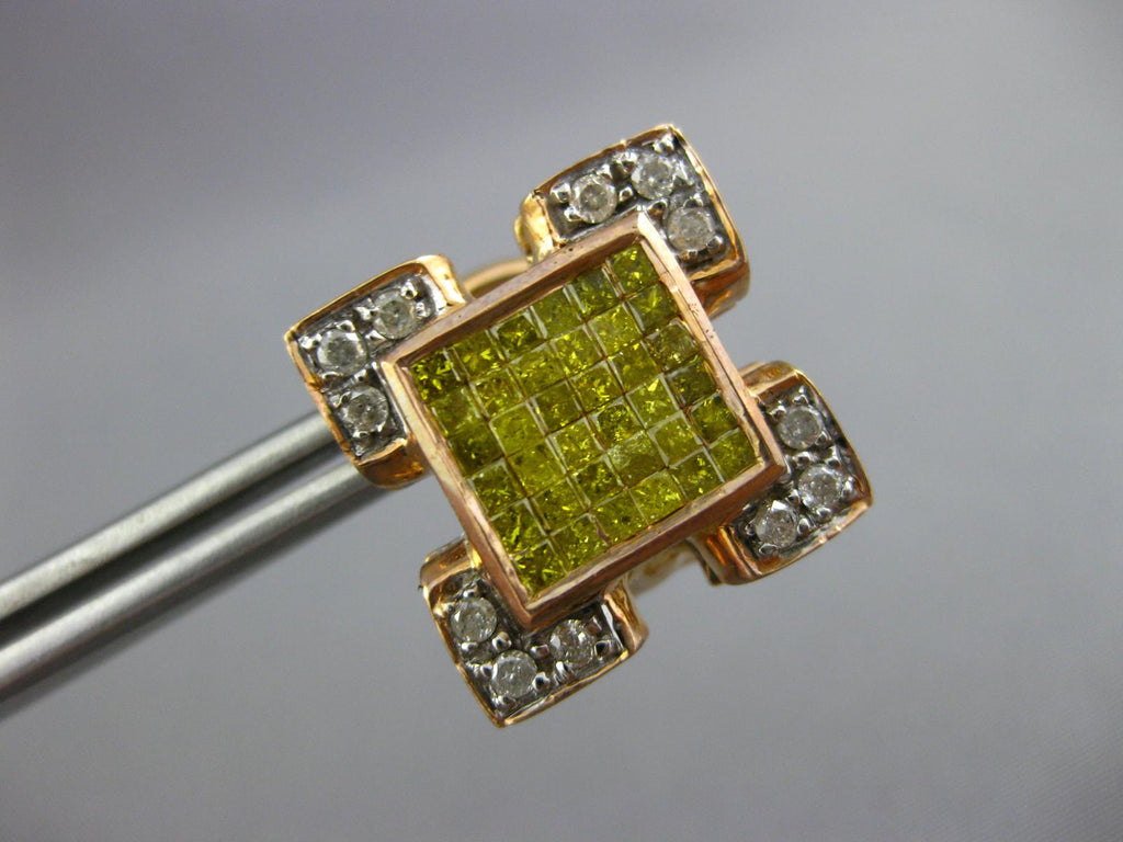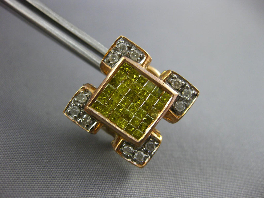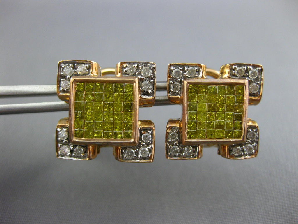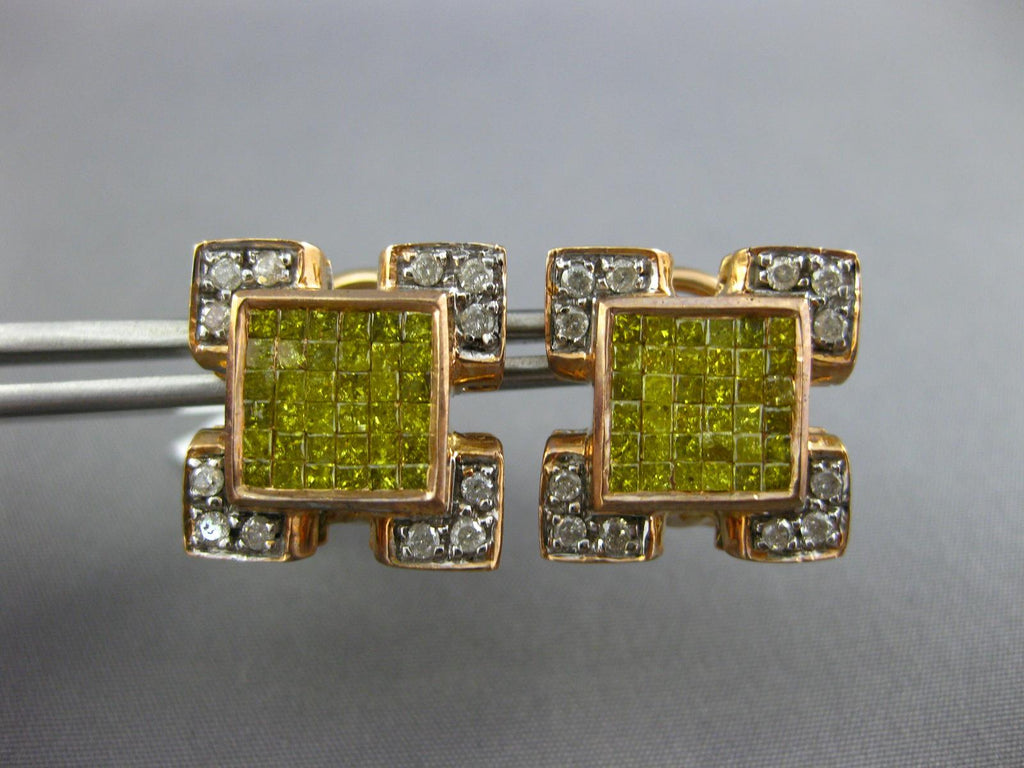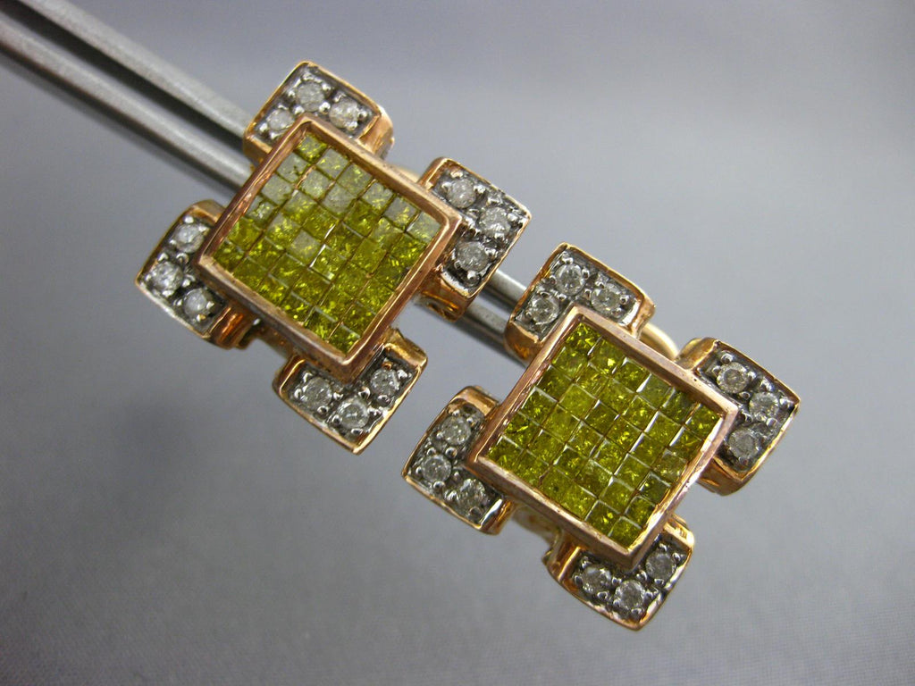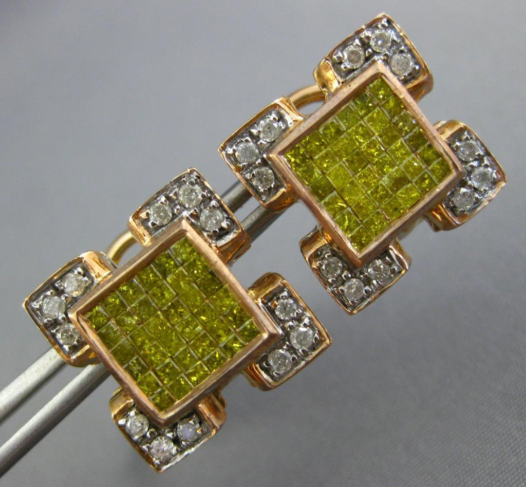 14KT ROSE GOLD CLIP ON HANGING EARRINGS. 3D INVISIBLE SQUARE DESIGN. WHITE DIAMONDS ARE H/I COLOR, VSSI CLARITY.  2.10 CARATS. ROUND WHITE DIAMONDS AND PRINCESS CUT FANCY YELLOW DIAMONDS ARE 2.10 CARATS. MEASURES 16mm X 16mm. WRITTEN APPRAISAL AVAILABLE. COMES IN A PRESENTABLE GIFT BOX.