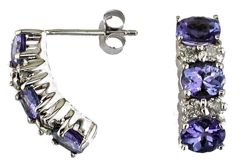 14KT WHITE GOLD HANGING EARRINGS. 3D THREE STONE PAST PRESENT FUTURE DESIGN. ROUND DIAMONDS ARE F/G COLOR, VSSI CLARITY .12 CARATS. AAA OVAL TANZANITES ARE 2.0 CARATS. WRITTEN APPRAISAL AVAILABLE. COMES IN A PRESENTABLE GIFT BOX.
