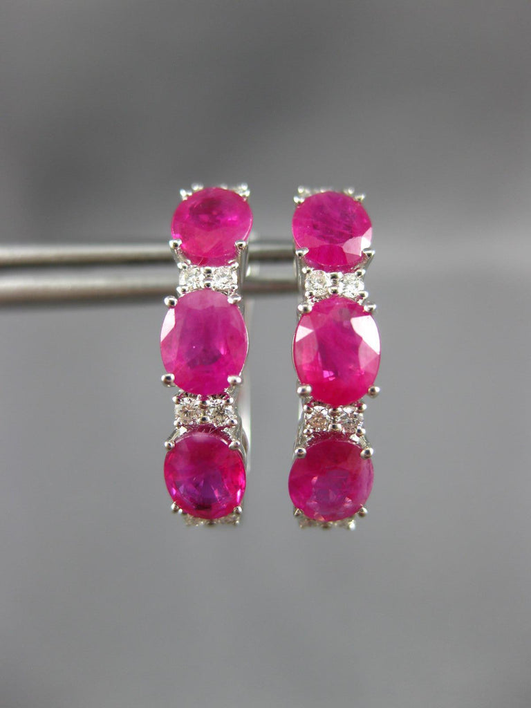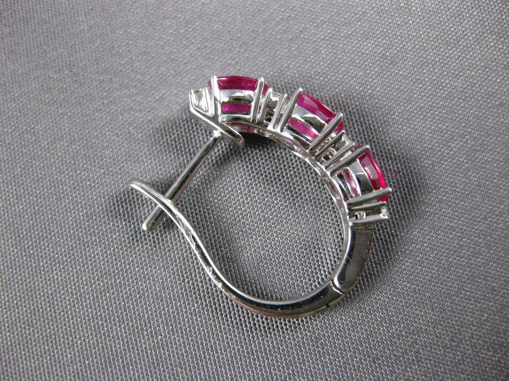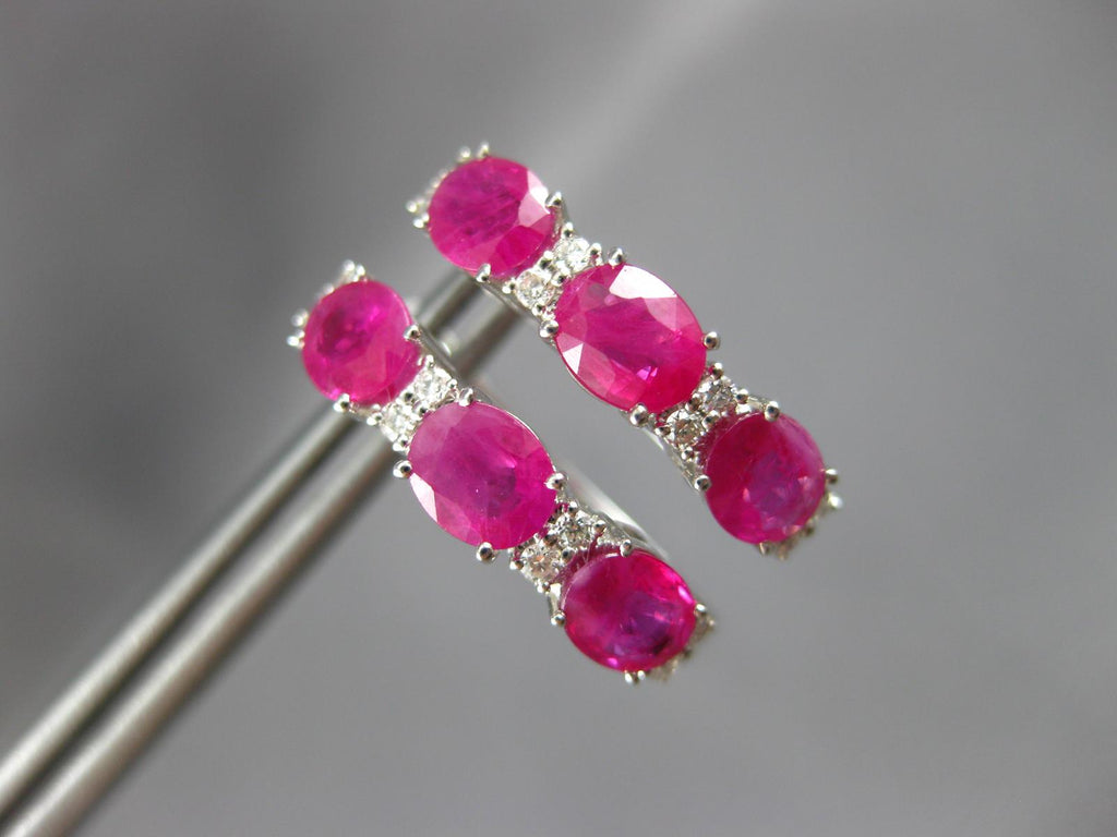 14KT WHITE GOLD LEVERBACK HANGING EARRINGS. 3D CLASSIC THREE STONE DESIGN. ROUND DIAMONDS ARE F/G COLOR, VSSI CLARITY .14 CARATS. AAA OVAL RUBIES ARE 2.0 CARATS. MEASURES 18.5mm X 4mm. WRITTEN APPRAISAL AVAILABLE. COMES IN A PRESENTABLE GIFT BOX.