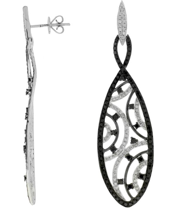 14KT WHITE GOLD HANGING EARRINGS. 3D OPEN FILIGREE TEAR DROP INFINITY DESIGN. WHITE DIAMONDS ARE F/G COLOR, VSSI CLARITY .35 CARATS. BLACK DIAMONDS ARE 1.75 CARATS. WRITTEN APPRAISAL AVAILABLE. COMES IN A PRESENTABLE GIFT BOX.