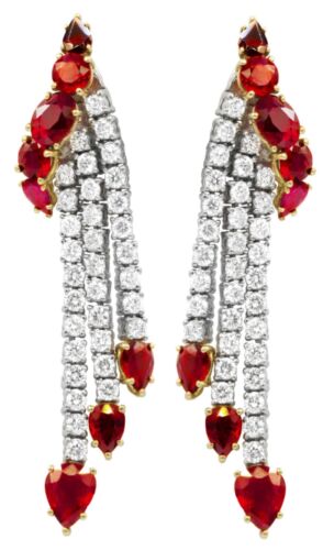 18KT YELLOW GOLD AND PLATINUM HANGING EARRINGS. 3D MULTI ROW DOUBLE HEART CHANDELIER DESIGN. DIAMONDS ARE G/H COLOR, VSSI CLARITY 7.6 CARATS. AAA MULTI SHAPE RUBIES ARE 14.8 CARATS. WRITTEN APPRAISAL AVAILABLE. COMES IN A PRESENTABLE GIFT BOX.