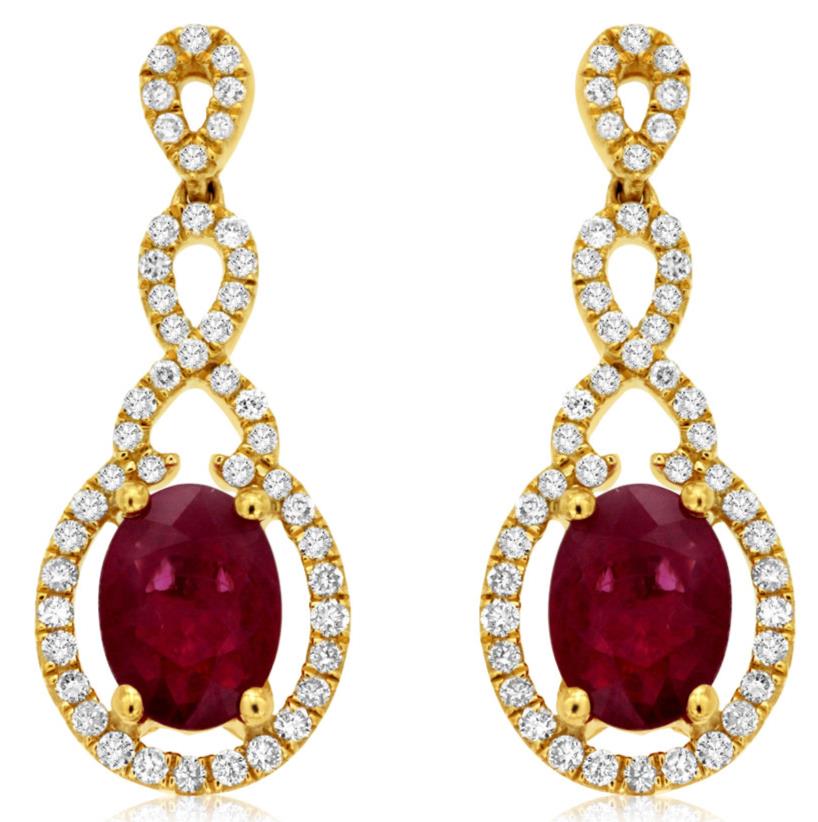 14KT YELLOW GOLD HANGING EARRINGS. 3D INFINITY TEAR DROP DESIGN. ROUND DIAMONDS ARE F/G COLOR, VSSI CLARITY .42 CARATS. AAA OVAL RUBY IS 1.80 CARATS. WRITTEN APPRAISAL AVAILABLE. COMES IN A PRESENTABLE GIFT BOX.