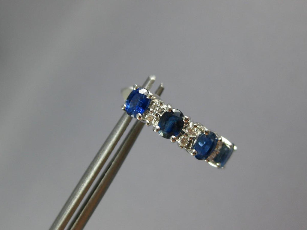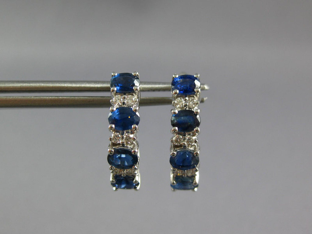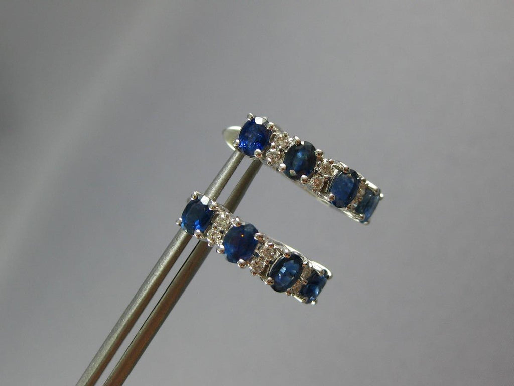14KT WHITE GOLD LEVERBACK HANGING EARRINGS. 3D FOUR STONE DESIGN. ROUND DIAMONDS ARE F/G COLOR, VSSI CLARITY .14 CARATS. AAA OVAL SAPPHIRES ARE 2.13 CARATS. MEASURES 17mm X 4.5mm. WRITTEN APPRAISAL AVAILABLE. COMES IN A PRESENTABLE GIFT BOX.