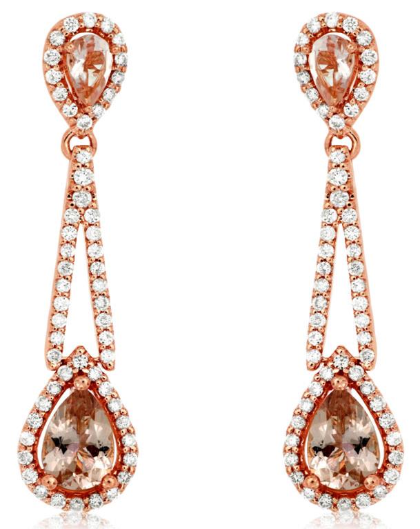 14KT ROSE GOLD HANGING EARRINGS. 3D TEAR DROP CLASSIC DESIGN. ROUND DIAMONDS ARE F/G COLOR, VSSI CLARITY .66 CARATS. AAA PEAR SHAPE MORGANITES ARE 1.75 CARATS. WRITTEN APPRAISAL AVAILABLE. COMES IN A PRESENTABLE GIFT BOX.
