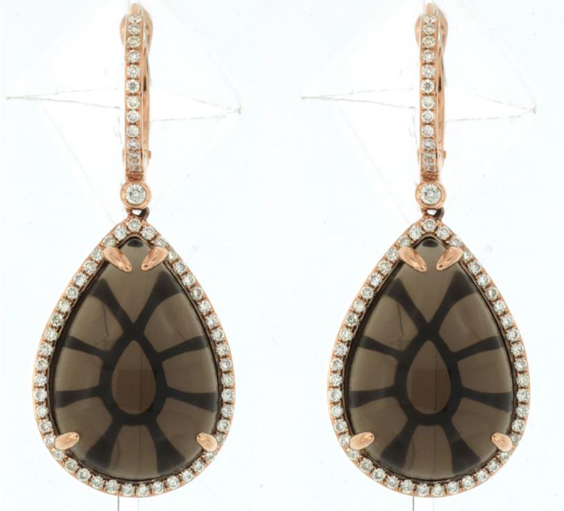 14KT ROSE GOLD HANGING EARRINGS. 3D CLASSIC TEAR DROP DESIGN. DIAMONDS ARE F/G COLOR, VSSI CLARITY .78 CARATS. AAA SMOKY TOPAZ ARE 25.20 CARATS. WRITTEN APPRAISAL AVAILABLE. COMES IN A PRESENTABLE GIFT BOX.